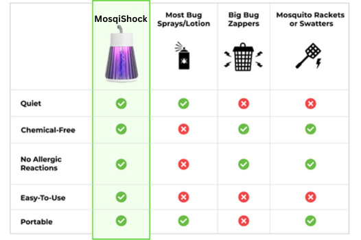 MosqiShock uses LED lights to attract mosquitoes and an electric coil to instantly zap them, creating a mosquito-free area.